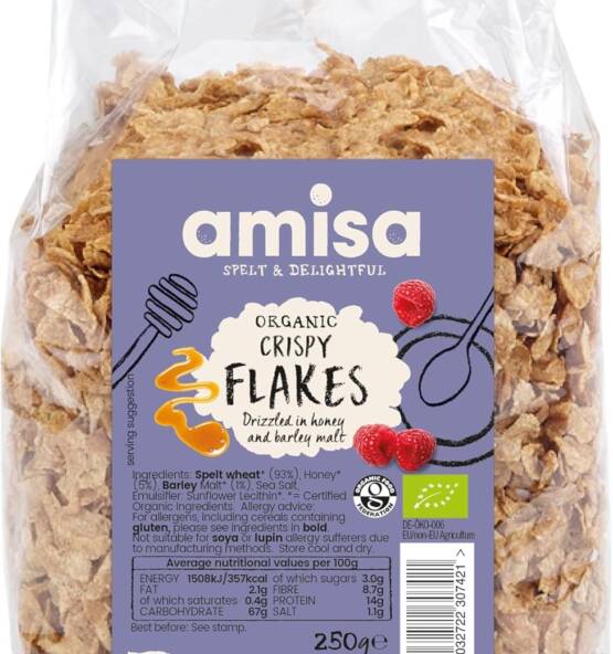 Amisa organic spelt crispy flakes are high in fibre, has a higher content of protein and vitamins than wheat and although not gluten free, spelt can be tolerated by some people with wheat allergies. Spelt is one of the oldest cultivated grains (an ancient cousin of wheat). Lightly toasted flakes drizzled in honey and barley malt. Perfect for breakfast with milk or yoghurt. Certified organic ingredients. It is suitable for vegetarian.