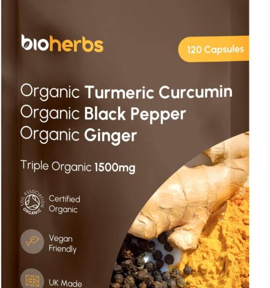 Text reads 'bioherbs', 'Organic Turmeric Curcumin', 'Organic Black Pepper'. Product packaging displays showing natural supplement branding and ingredients.